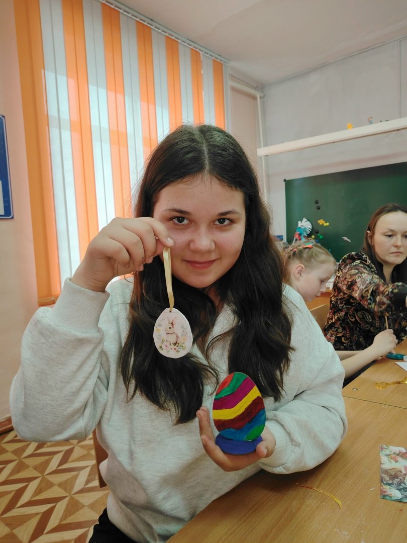 Участники мастер‑класса работали с заготовками из фанеры в форме яйца — символичного атрибута пасхальных традиций. Каждый смог проявить фантазию: