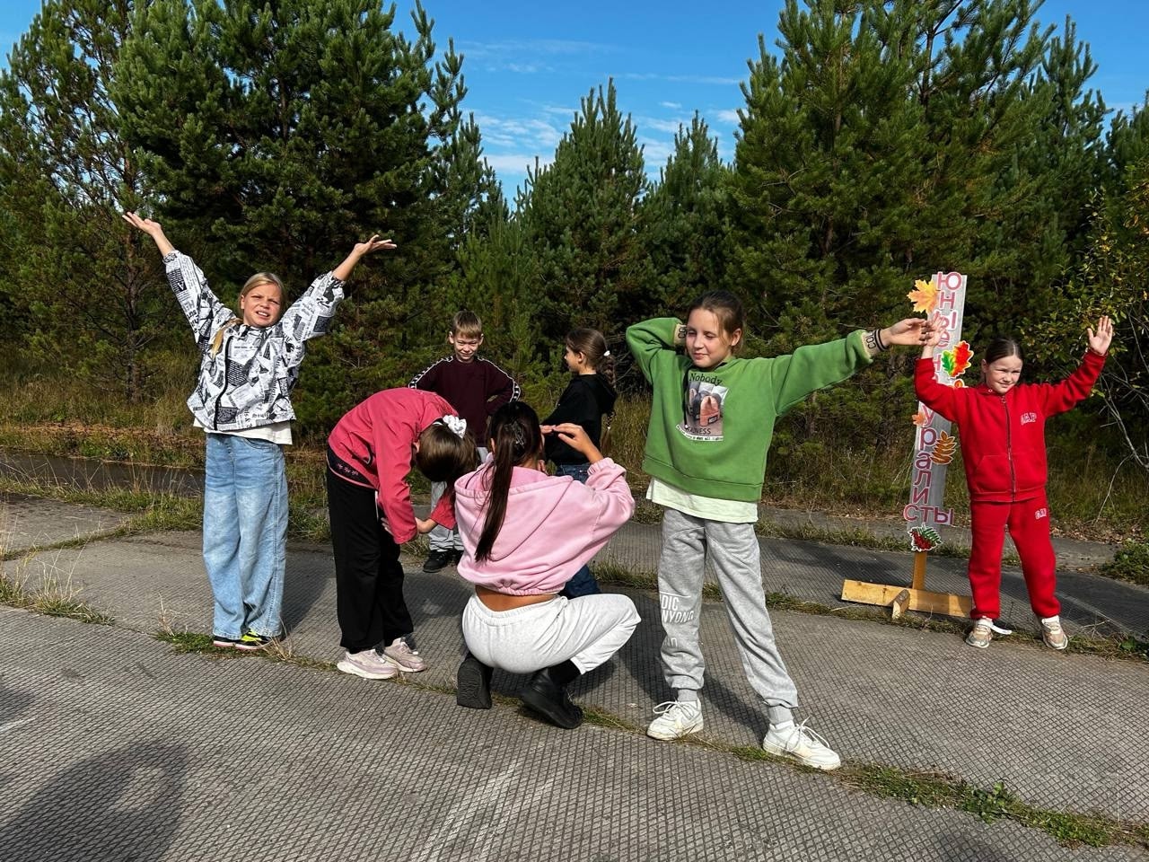 Активные игры захватили всех без исключения. На станции дети с удовольствием составляли слова из собственных тел, используя руки и ноги. Кто бы мог подумать, что из человеческого тела можно сложить целое слово на фоне природы?